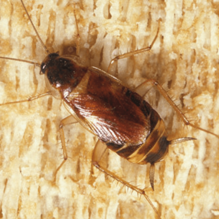 Een relatief grote kakkerlak met een glanzend roodbruine kleur. In het patroon herken je lichtgele plekken. Hij is groter dan de andere drie met zijn lichaamslengte van zo’n 3 – 4cm.